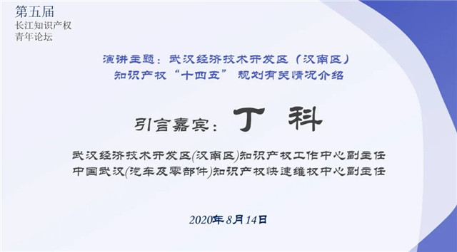 在引言演讲环节,武汉知识产权研究会副理事长、武汉经济技术开发区(汉南区)知识产权工作中心副主任、中国武汉(汽车及零部件)知识产权快速维权中心副主任丁科作题为《武汉经济技术开发区(汉南区)知识产权“十四·五” 规划有关情况介绍》的引言演讲。