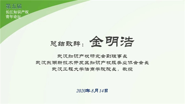 在闭幕环节,金明浩院长发表总结致辞。他指出,本届论坛主题鲜明、内容丰富、特色突出、亮点纷呈。陈保国副局长、张于威主任和丁科副主任在发言中回顾了武汉经开区知识产权工作的坚实基础,阐明了武汉经开区发展面临的重大契机,描绘了武汉经开区知识产权事业的未来宏图;四位演讲嘉宾和七位与谈嘉宾通过发表主题演讲和深度见解,对知识产权发展面临的战略性、全局性、引领性的问题进行了深入研讨,形成了一系列建设性观点,为武汉经开区知识产权“十四·五”规划的编制找准着力点和展开面提供了高端智力支撑。最后,他代表论坛所有组织方,向与会各界人士表达诚挚的感谢和美好的祝愿!