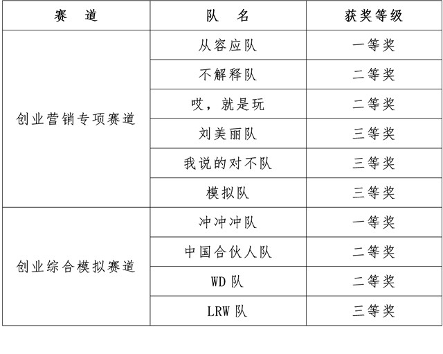 经过激烈角逐,创业综合模拟赛道和创业营销专项赛道的比赛落下帷幕,创业营销专项赛道中有6支队伍分别获得一二三等奖,创业综合模拟赛道有4支队伍分别获得一二三等奖。