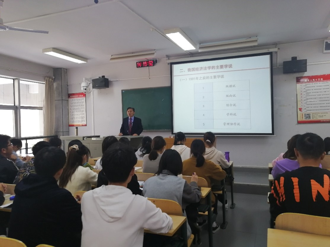 许承光教授为师生讲授《经济法》,从“法与法学”引入“经济法与经济法学”,延伸至我国经济法学的主要学说。在介绍学习经济法的主要方法时,特别强调应将习近平法治思想融入经济法的学习研究中。课堂上的讲解深入浅出,气氛活跃,充分展示了我院优秀教师的课堂驾驭能力与扎实的基本功。
