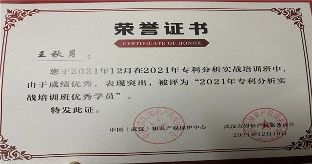 (通讯员 王秋月)日前,由中国(武汉)知识产权保护中心、武汉市知识产权服务协会举办的武汉2021年专利分析培训班圆满结束。雷竞技电竞平台官网研究生王秋月、龙佳馨、王湘利、陈锐参与了本次专利培训。