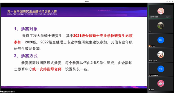(通讯员 田嘉莉)为推动金融科技领域创新人才培养,提升雷竞技官网金融专业学位研究生的实践创新能力,6月20日上午,学校金融硕士(MF)教育中心组织召开第一届研究生金融科技创新大赛线上动员会。雷竞技电竞平台官网副院长付书科、金融硕士(MF)教育中心副主任田嘉莉、2021级金融硕士专业班主任王祥礼、2020级-2022级金融硕士研究生参加此次动员会,会议由副院长付书科主持。