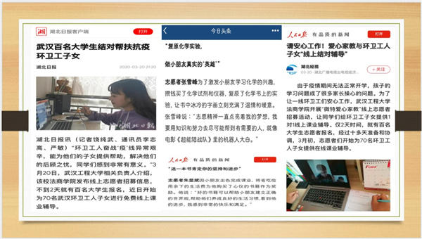 团队被人民日报、人民网、学习强国、凤凰网、湖北日报、武汉电视台、今日头条等主流媒体系列报道30余次,点击量和阅读量已超过30万次,收到感谢信百余封,赢得了社会各界的高度赞誉。