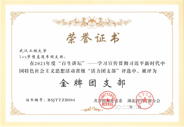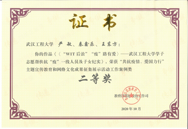 荣获教育部“共抗疫情 爱国力行”主题教育优秀成果二等奖(案例类全国前十);志愿服务项目《“童”心协力——环卫工子女融合帮扶》荣获团中央2020年全国志愿服务项目大赛银奖;2020年湖北省高校实践育人特色项目重点立项建设;志愿服务项目《“WIT后浪 援爱同行》获2020年湖北省志愿服务项目大赛银奖;“荣获2021年第七届中国国际“互联网+”大学生创新创业大赛湖北省铜奖;“1+X”梦想直通车团支部荣获湖北省金牌活力团支部和决赛二等奖;志愿服务项目《“四点半”学校》被评为武汉市2020年最佳志愿服务项目;志愿服务队被评为学校“抗疫工作先进集体”。