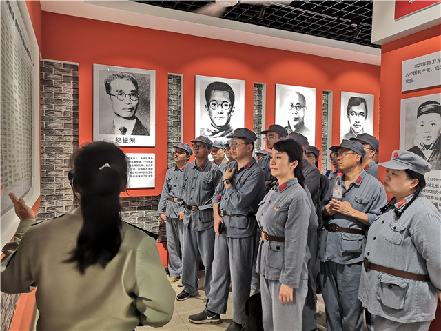 在现场教学的最后一站,大家参观了大别山革命历史文化陈列馆,在讲解员的带领下师生党员们专注地学习现场解析、视频、图片、文字、实物等材料,体会红二十五军一路硝烟、一路征战所向披靡的战斗场景。“牛背脊骨、独树镇、庾家河,荆紫关,袁家口”等地皆因红军的浴血奋战而载入军史;在恶劣的环境中,置个人生死于度外,英勇顽强、不怕牺牲的战斗精神,中共鄂豫皖省委书记徐宝珊积劳病逝,红二十五军政委吴焕先英勇牺牲,军长徐海东负重伤,他们的壮举和事迹再次证明了共产党人为革命事业而勇于牺牲的高贵品质;还有那些为掩护红军失去亲人的劳苦大众,他们同红二十五军战士一道成为共和国永垂不朽的人。在场的每一名师生党员心灵都受到了震撼,精神接受了洗礼,理想信念也得到进一步升华。